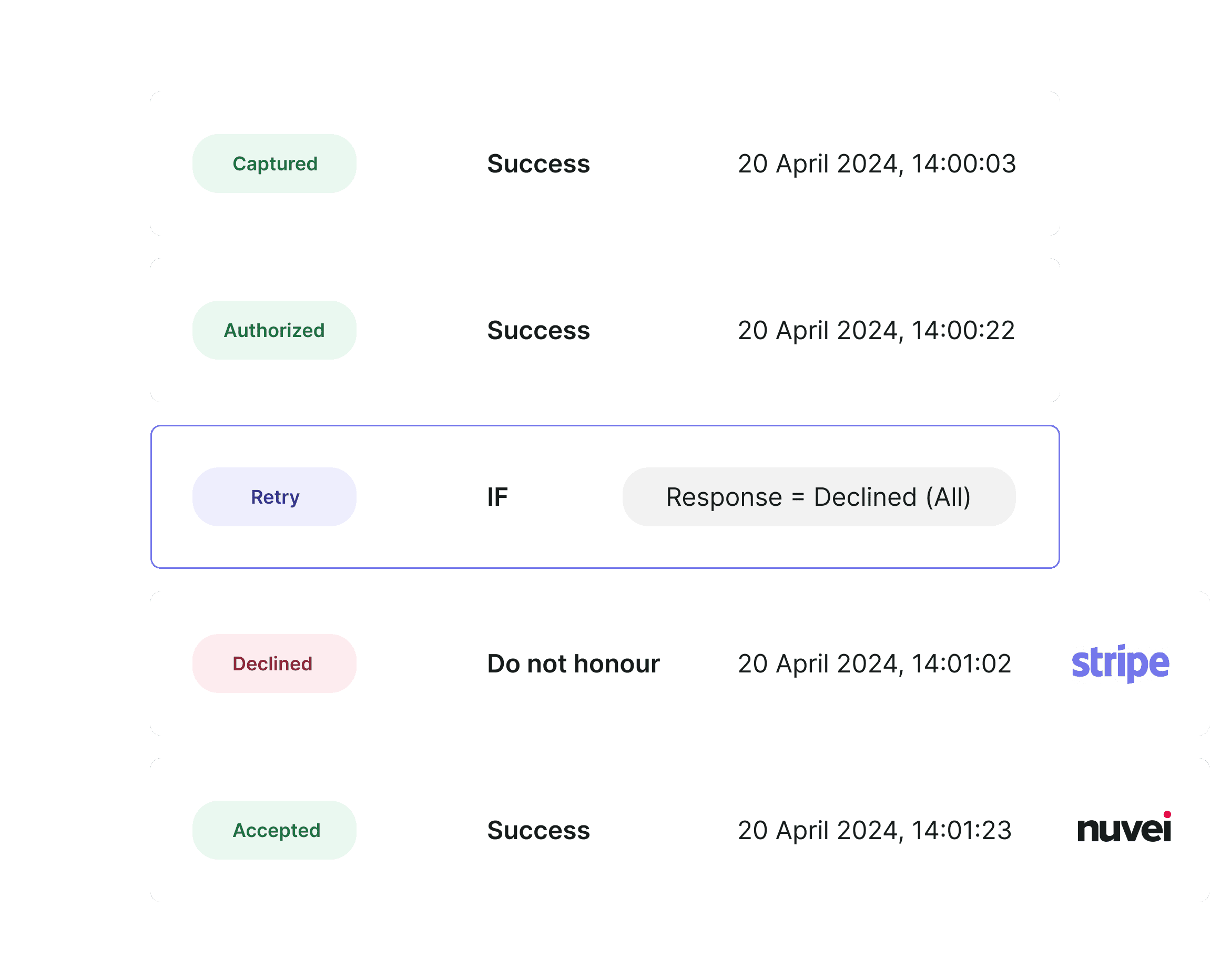 When a transaction is declined, orchestration platforms analyze the decline code and automatically retry with optimized parameters: